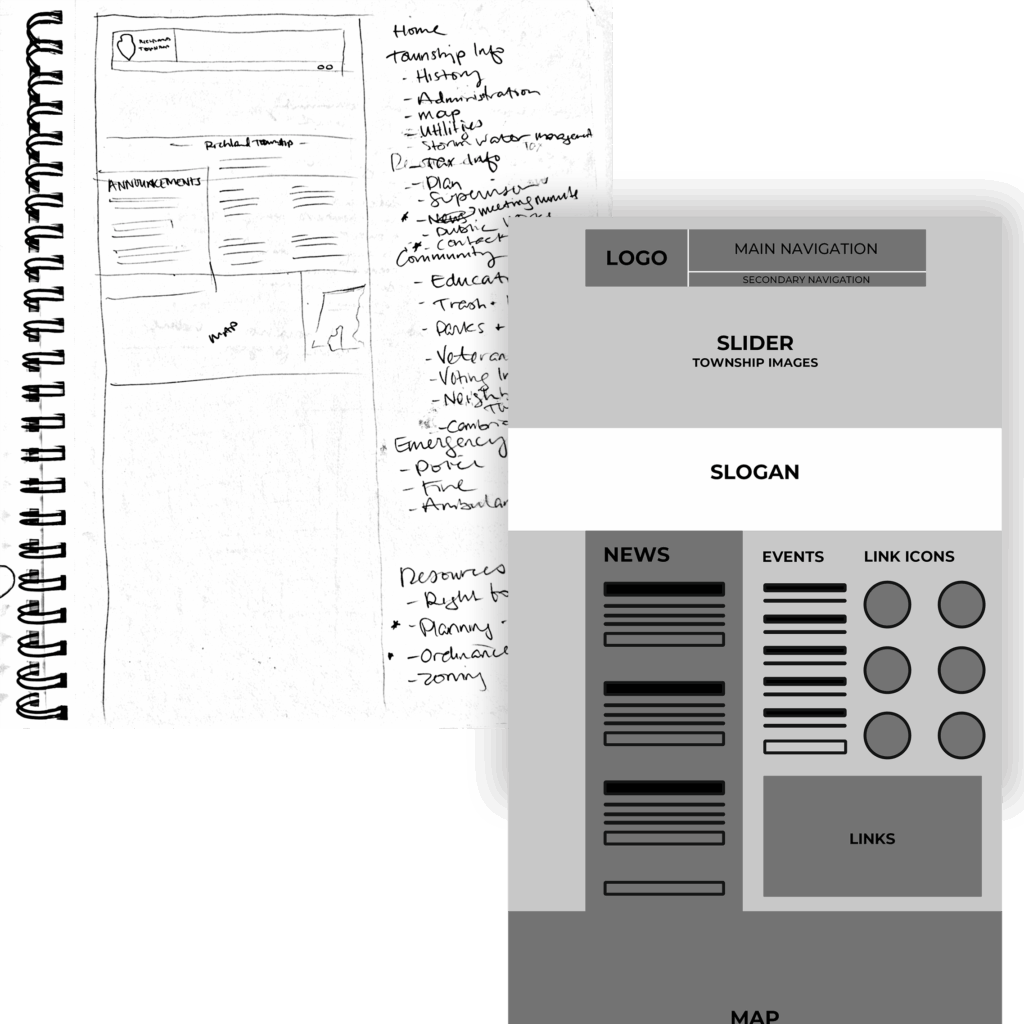 Sketched arrangement of prominent content sections for Homepage as well as any other major page
