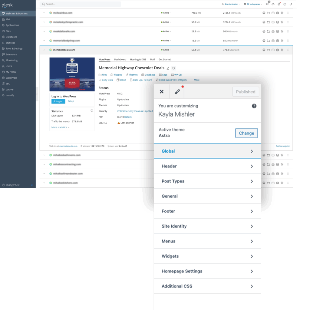 WordPress and required plugins installed on a temporary subdomain for live production via Plesk